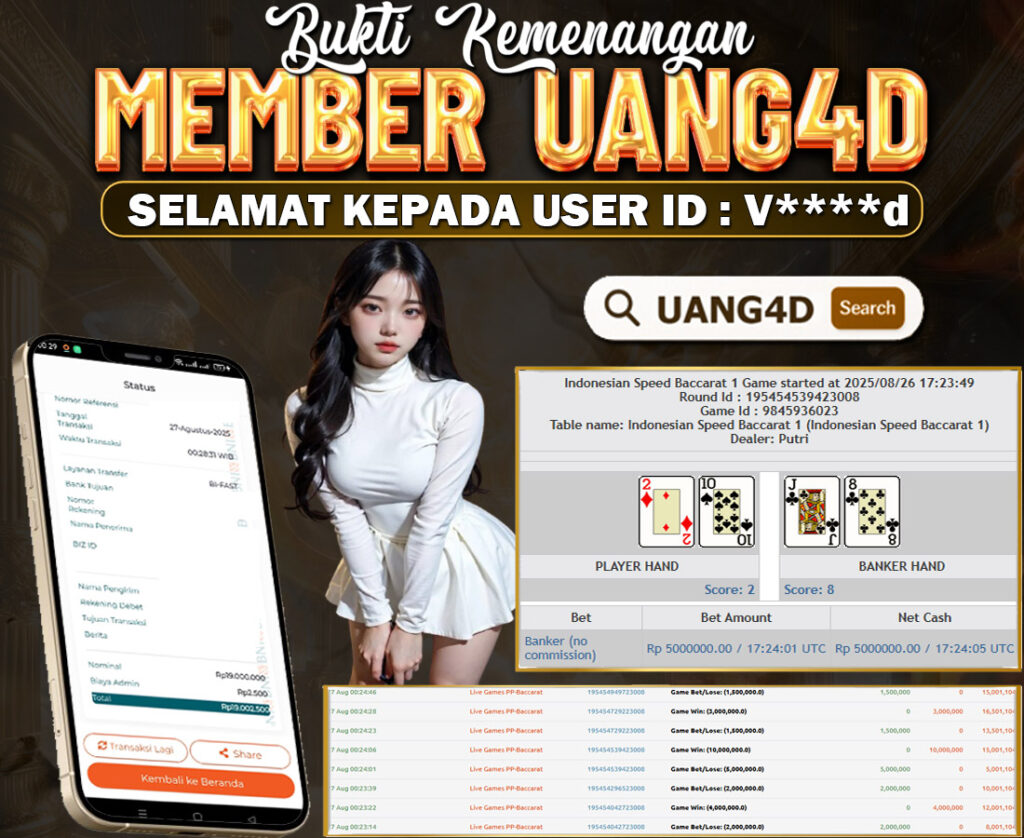 Setiap hari, member UANG4D berhasil meraih jackpot besar dari berbagai macam permainan livecasino ternama yang kami sediakan, seperti Roullete, Dragon & Tiger, Qiu Qiu dan masih banyak lagi. Kami secara rutin menampilkan bukti screenshot atau rekapan kemenangan yang berhasil diraih, mulai dari kemenangan ratusan ribu hingga puluhan juta rupiah. Semua slip kemenangan ini kami hadirkan untuk membuktikan bahwa di UANG4D, peluang menang itu nyata.