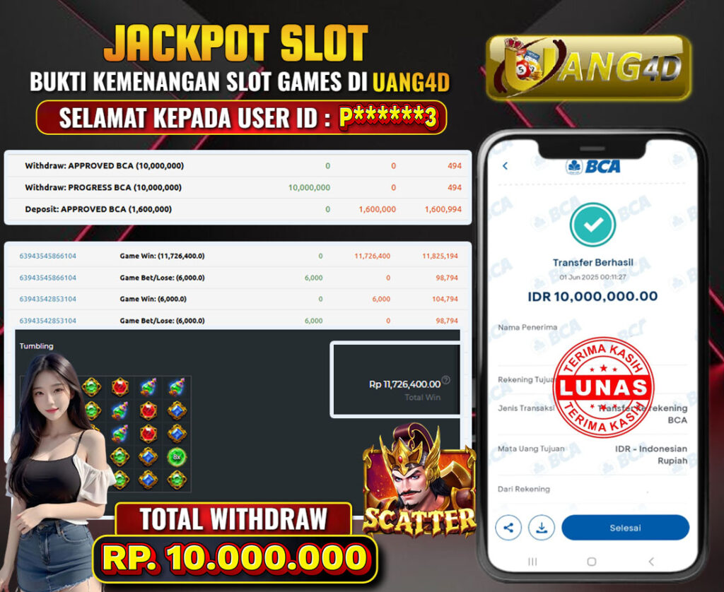 Jangan lewatkan kesempatan untuk meraih kemenangan besar. Daftar sekarang di UANG4D dan rasakan pengalaman bermain slot terbaik yang pernah ada! Putar gulungan, menangkan jackpot, dan jadilah bagian dari komunitas pemain sukses kami!