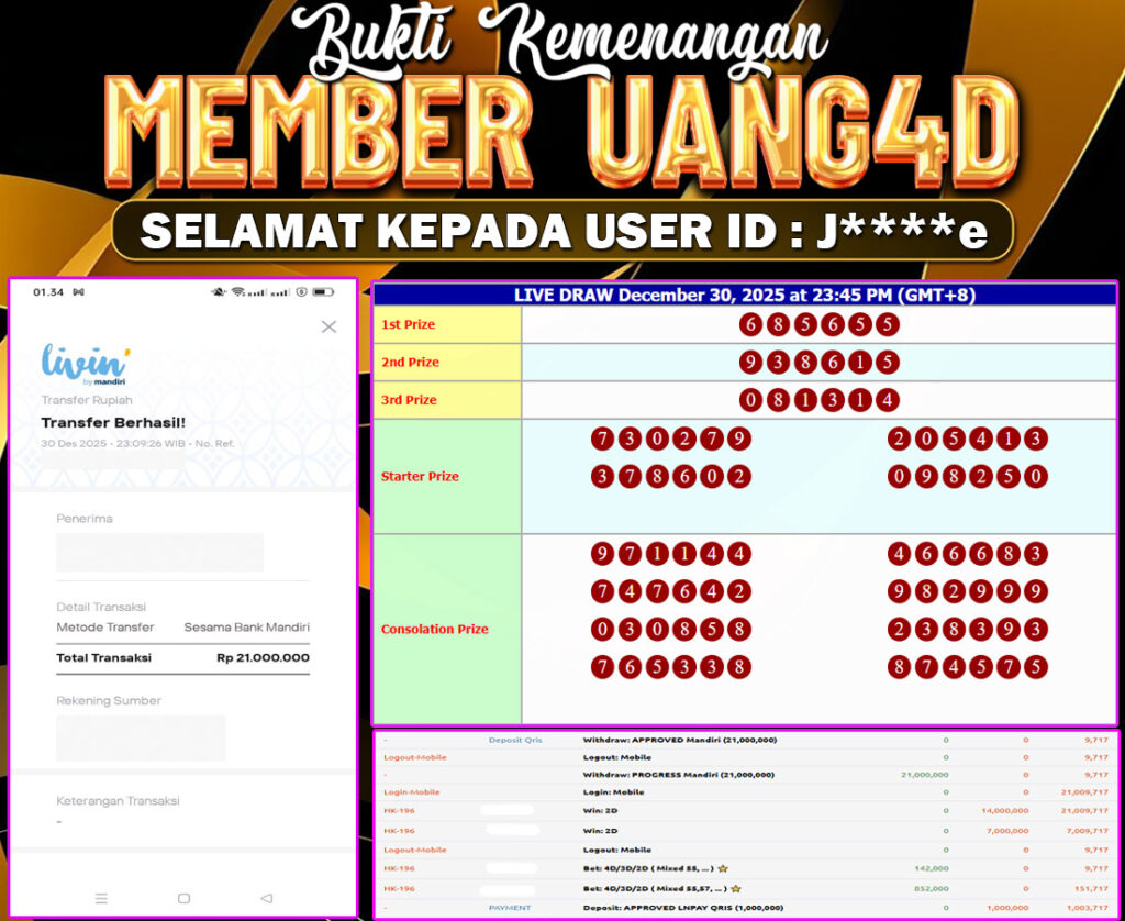 Setiap hari, member UANG4D berhasil meraih jackpot besar dari berbagai provider togel ternama yang kami sediakan, seperti Sydney, Singapore, Hongkong dan masih banyak lagi. Kami secara rutin menampilkan bukti screenshot atau rekapan kemenangan yang berhasil diraih, mulai dari kemenangan ratusan ribu hingga puluhan juta rupiah. Semua slip kemenangan ini kami hadirkan untuk membuktikan bahwa di UANG4D, peluang menang itu nyata.