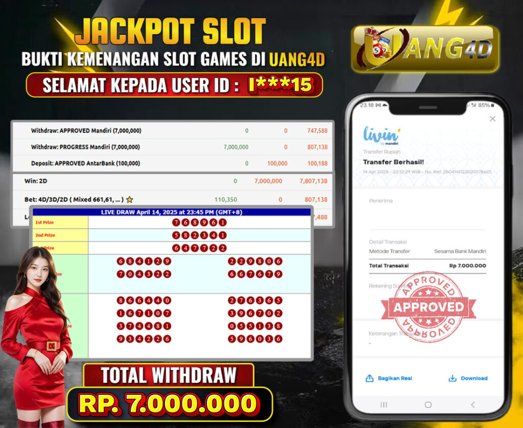 UANG4D dikenal sebagai situs terpercaya yang selalu menghadirkan pengalaman bermain slot online yang aman, fair, dan berlisensi resmi. Di sini, kami tidak hanya sekadar memberikan janji, tapi bukti nyata berupa slip kemenangan yang dapat Anda lihat secara langsung.